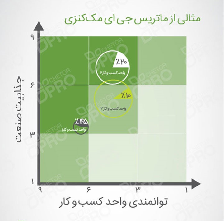 توانمندی واحد کسبوکار و جذابیت صنعت با جایگاه دایره در ماتریس نشان داده میشوند.