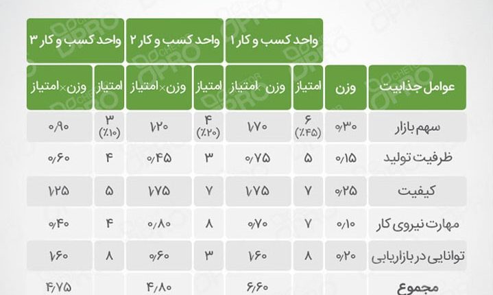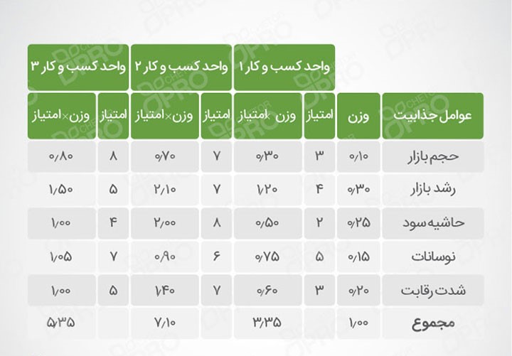 در محاسبهی هر عامل برای واحدهای کسبوکار، امتیازی که دادهاید را در وزن هر فاکتور ضرب کنید. سپس امتیازهای هر واحد کسبوکار یا محصول را با هم جمع کنید. میتوانید نمونهی این کار را در جدول زیر مشاهده کنید.